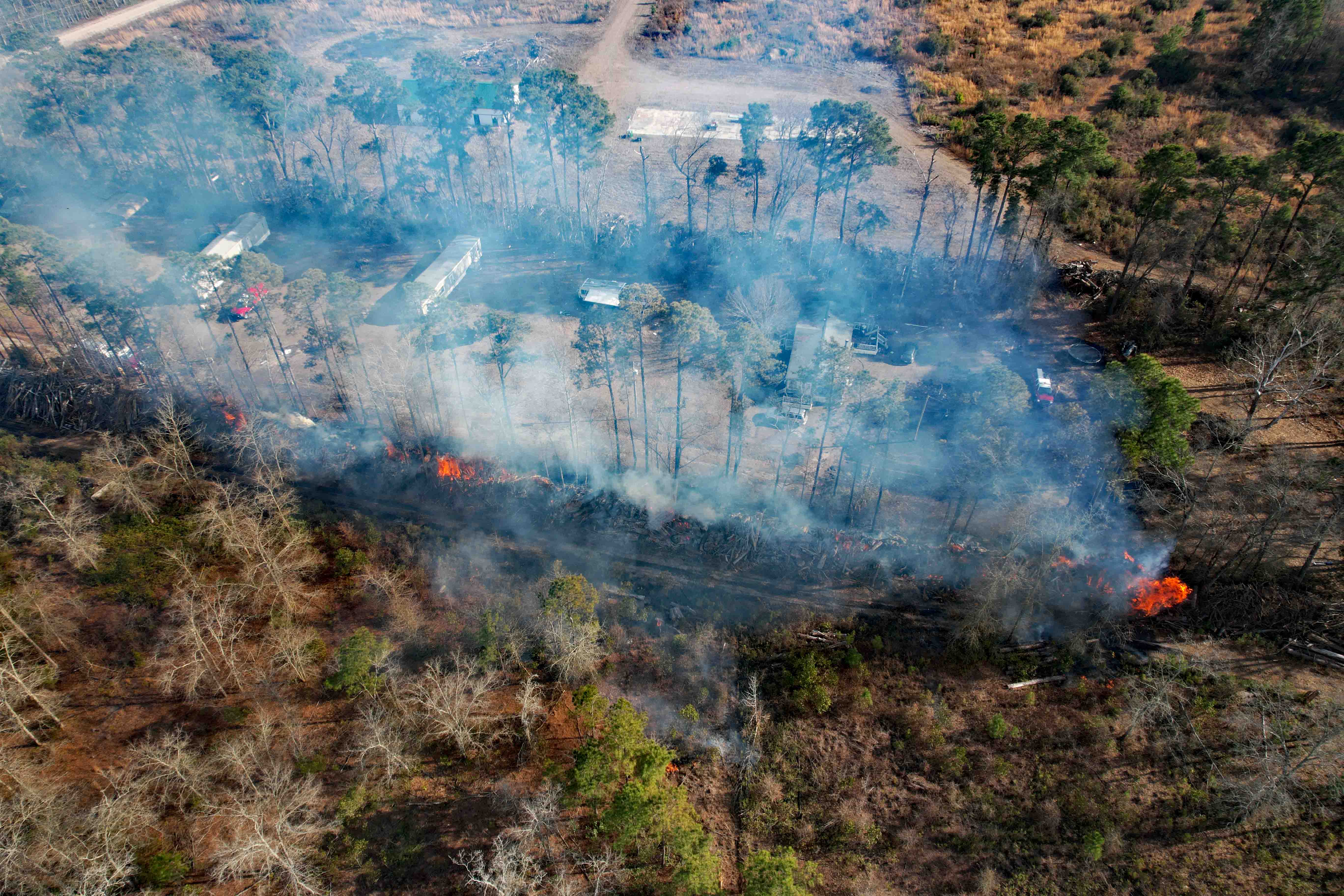fire with flames 50 feet in the air. The piles of land clearing