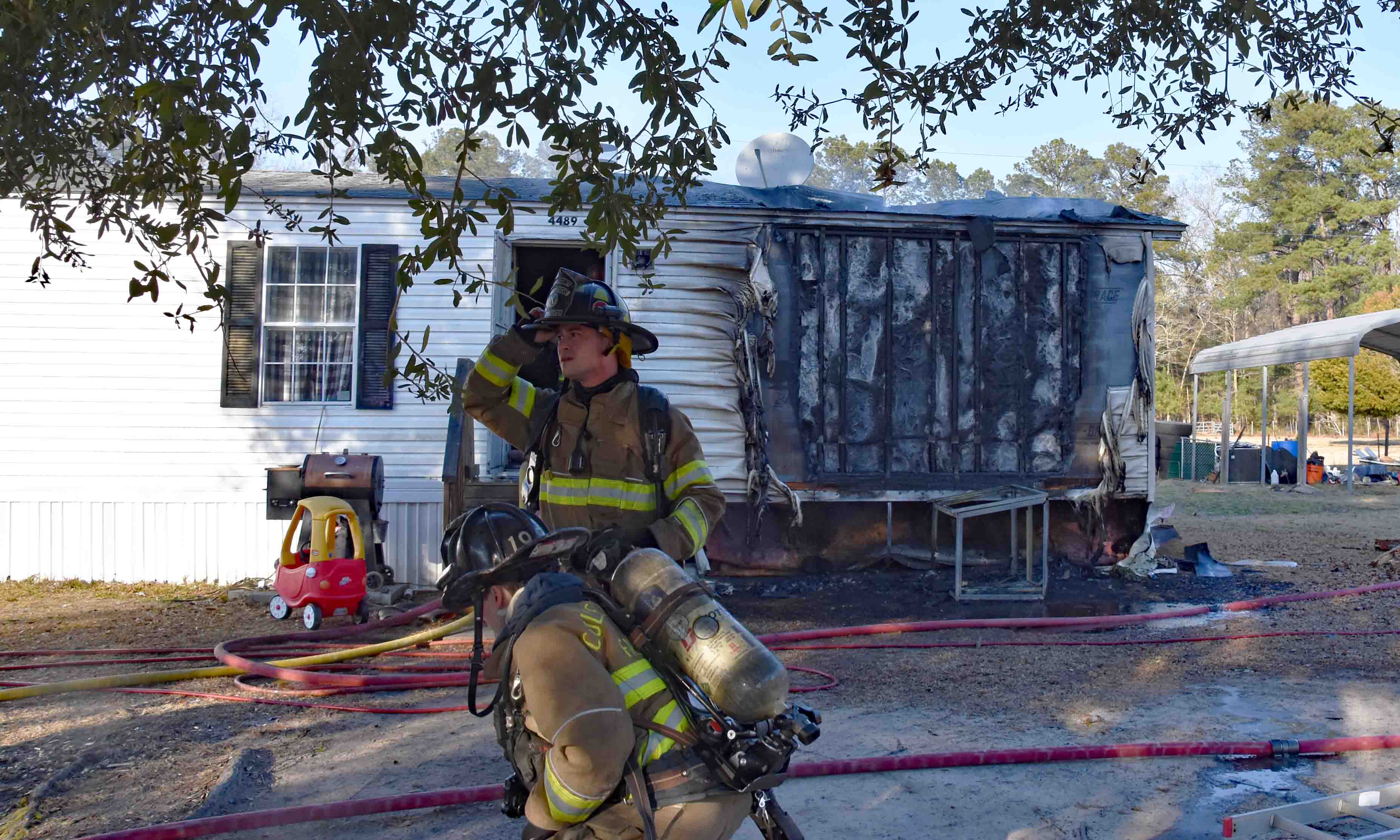 09/February/2026 - Structure Fire - "B" Shift Incident # 26-01118 - At 16:02, Tuesday afternoon 09-Feburary a fire was discovered in a residence in the 4400 block of Green Pond Hwy. Several Fire-Rescue units were already responding to a woods fire on nearby Rodeo Drive and were diverted to the structure fire. This placed units on the scene fairly quickly. Engine 26 arrived to find heavy smoke conditions and fire coming from the roof of the singlewide mobile home. Firefighter-Paramedics deployed multiple handlines to the building and crews entered the structure through the front door. The fire had burned vertically up the side of the structure and entered the attic space. The roof burned off of the building over one bedroom but firefighters were able to stop the fire and the spread through the attic space. They had to pull the ceilings down in several places to reach the fire burning above the ceiling. No injuries were reported during the incident. The family was displaced due to the damage to the home but most personal items were saved. The cause appears to have been a heating lamp in a dog house located next to the building. The fire destroyed the dog house and spread to the adjacent mobile home. Crews were on the scene for two hours. Engine 6, Engine 19, Engine 24, Engine 26, Engine 27, Tender 1, Tender 6, Tender 19, Tender 24, Tender 27, Medic 1, Medic 6, Medic 19, Medic 26, Battalion 1, Car 103, Car 116 and Car 118 responded. Battalion Chief Brent Dalton served as incident Commander. |