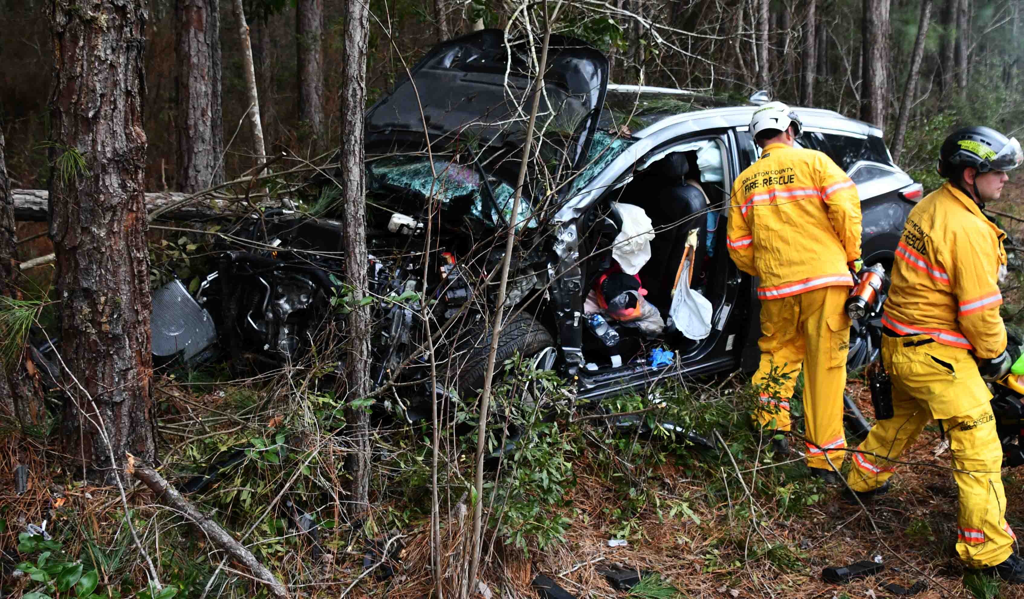 11/February/2026 - MVC with Entrapment and Air Evac Incident # 26-01173 - A motorist was severely injured in a two vehicle MVC on Interstate 95 near the 67 mile marker northbound. The Nissan Murano collided with a minivan then veered off of the roadway. The car went down an embankment and struck several trees. The Nissan sustained heavy damage trapping the driver in the wreckage. The two adults in the minivan were not injured. Initial 9-1-1 calls indicated the driver was unconscious at one point. Firefighter-Paramedics arrived and began treating the occupant in the car, while other crewmembers used Holmatro Pentheon Rescue Tools to remove the driver's door and a hydraulic ram to displace the dash and steering wheel. A medical helicopter was requested. CARE Flight responded to the parking lot at the Circle C Truck Stop. Fire-Rescue Medic 26 transported the patient to the Truck Stop to meet with the Flight Crew. The patient was flown to the Trauma Center at HCA Trident Hospital in North Charleston. The SC Highway Patrol is investigating the crash. Engine 5, Engine 26, Rescue 1, Medic 26, C112 and CARE Flight responded. Battalion Chief Chris Jones served as Incident Commander. |