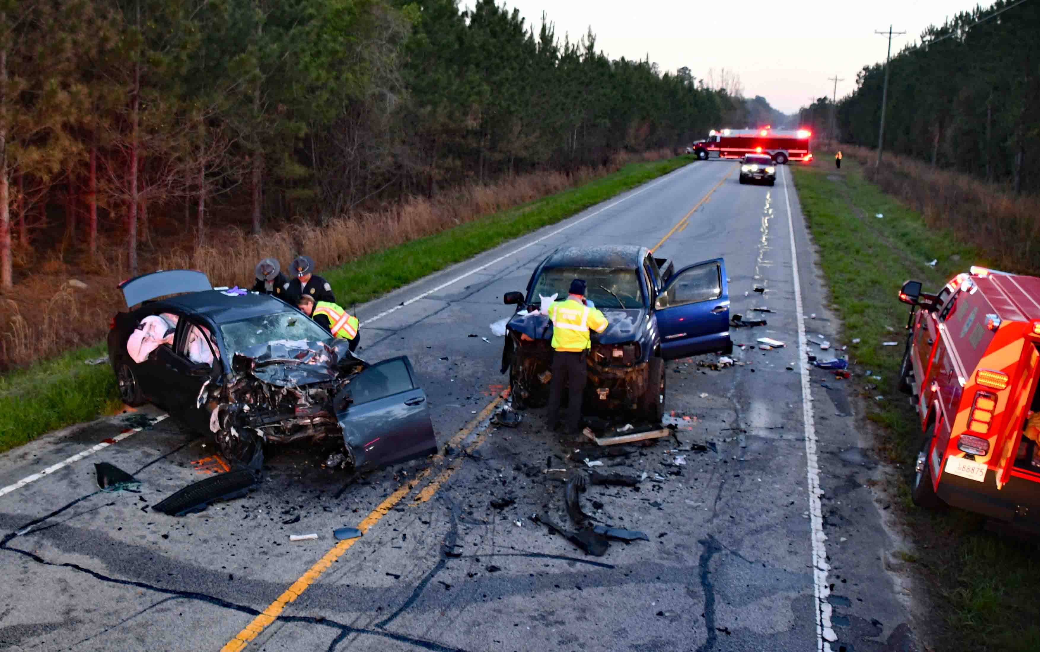 20/March/2026 - Fatal MVC with Entrapment - "C" Shift Incident # 26-02248 - Two adults perished and another was seriously injured in a two vehicle head-on collision on Jefferies Hwy. (US Hwy 15) at Timberwood Road near Canadys Friday morning 20-March. The accident was reported at 05:56. A southbound Toyota Tacoma pickup truck and a northbound Toyota Corolla collided blocking the two lanes of the rural highway. The two unrestrained occupants of the Corolla received multiple traumatic injuries and were trapped in the wreckage. The restrained driver of the pickup received non-life threatening injuries. Firefighter-Paramedics determined the two occupants of the Corolla had no signs of life and requested the Coroner's Office who responded to the location. The driver of the Tacoma was treated at the scene, then transported to HCA Colleton Hospital in Walterboro. Jefferies Hwy. was blocked for several hours while the SC Hwy Patrol and Coroner's Office investigated the MVC. Engine 5, Engine 19, Engine 26, Medic 19, Medic 26, Rescue 1 and Battalion 1 responded. Battalion Chief Chris Jones served as incident Commander. |