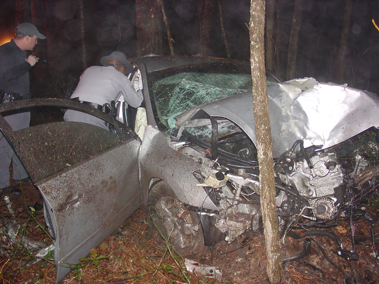 apparently striking a large tree head-on. The car then spun around and
