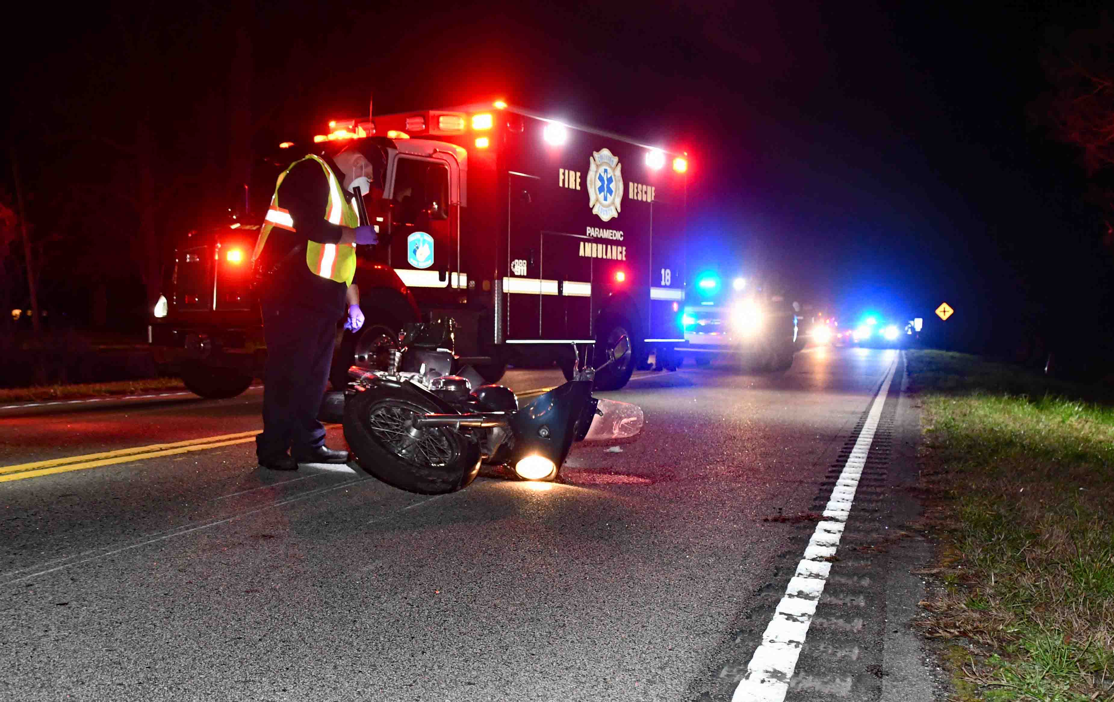 08/February/2021 - Fatal Motorcycle MVC with Air Evac - "B" Shift Incident # 21-01001 - An adult male received fatal injuries and an adult female was critically injured when the motorcycle they were riding struck a hog in the 12800 block of Sniders Hwy (SC Hwy. 63) Monday evening 08-February at 19:32. The motorcycle was traveling northbound on the dark stretch of rural highway when it collided with the large black animal. Both occupants on the motorcycle were thrown into the highway, with the male landing in the southbound lane. A southbound passenger car struck the man after he fell from the motorcycle. Fire-Rescue units arrived about ten minutes later and found the man to be deceased and the woman with critical traumatic injuries, including a head injury. Firefighters blocked both travel lanes to secure the scene for Law Enforcement. They treated the woman and requested a medical helicopter. C.A.R.E. Flight responded and landed in a field at Sniders Crossroads. The woman was transported in Fire-Rescue Medic 1 to the landing zone with additional Firefighter-Paramedics assisting with her care. She was transferred to the Flight Crew. Advanced airway treatment was necessary to secure her airway. She was flown to the Trauma Center at Trident Medical Center in North Charleston. The stretch of Sniders Hwy. was closed for about three hours while the Coroner and SC Hwy Patrol conducted their investigations. |