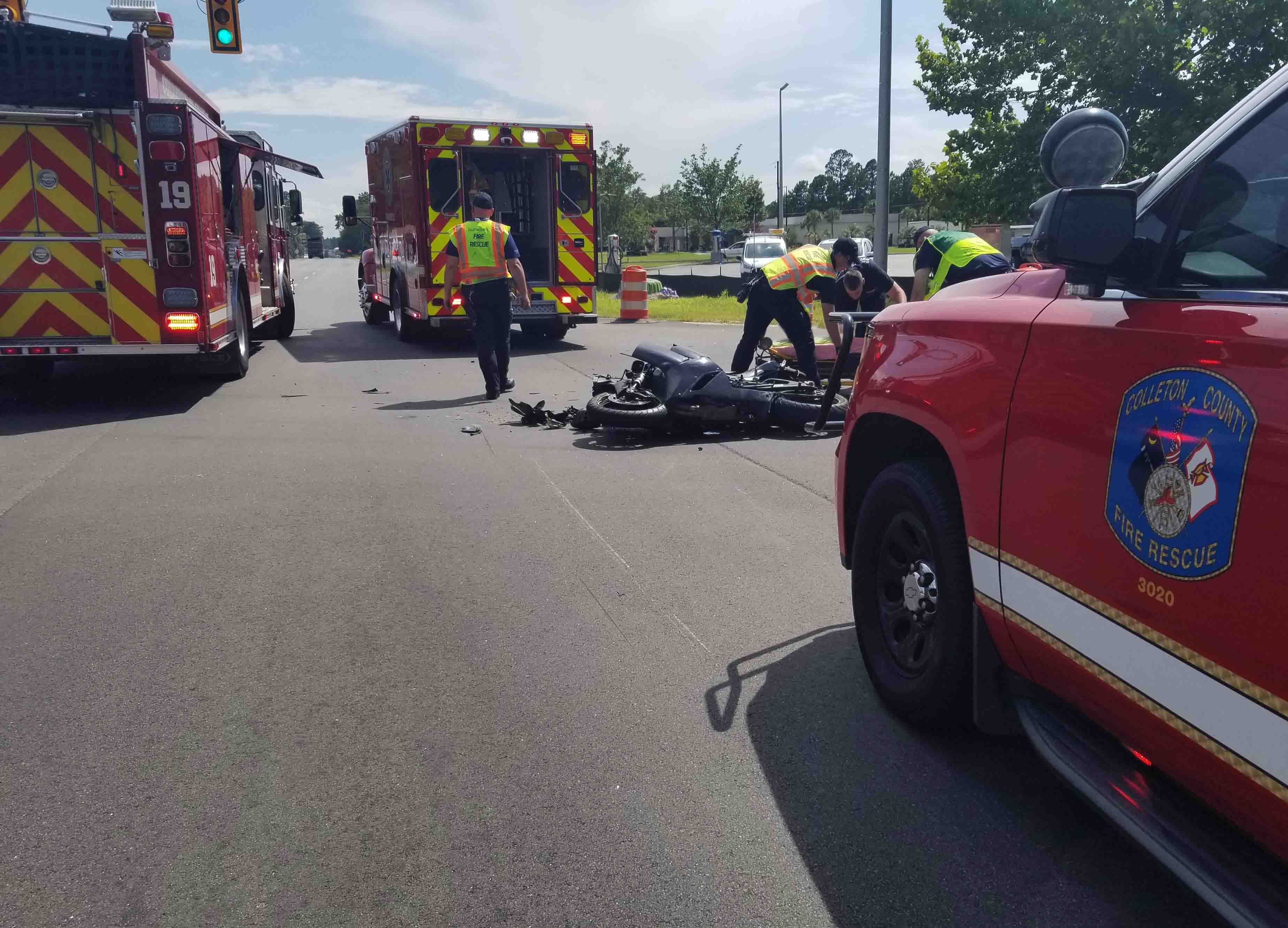 06/July/2021 - SUV vs Motorcycle MVC - "C" Shift Incident # 21-04733 - A 28 yr old Walterboro man was critically injured when his motorcycle collided with a SUV at the intersection of Jefferies Hwy. (US Hwy 15) and Academy Road. The motorcycle was traveling southbound on Jefferies Hwy. and struck the side of the SUV. The driver of the SUV was not injured. The motorcycle driver, who was wearing a helmet which protected his head, suffered multiple life threatening traumatic injuries. Fire-Rescue units arrived quickly and began treating his injuries. The CARE Flight helicopter was placed on standby. Firefighter-Paramedics transported the man emergent to the helipad at Colleton Medical Center in Fire-Rescue Medic 19. Advanced airway techniques were required to secure his airway and maintain his breathing. He was transferred to the Flight Crew, then flown by CARE Flight to the Trauma Center at MUSC in Charleston. He remained in critical condition. The SC Highway Patrol is investigating the incident. Engine 19, Medic 19 and Car 112 responded. Battalion Chief Scott Feather served as Incident Commander. |