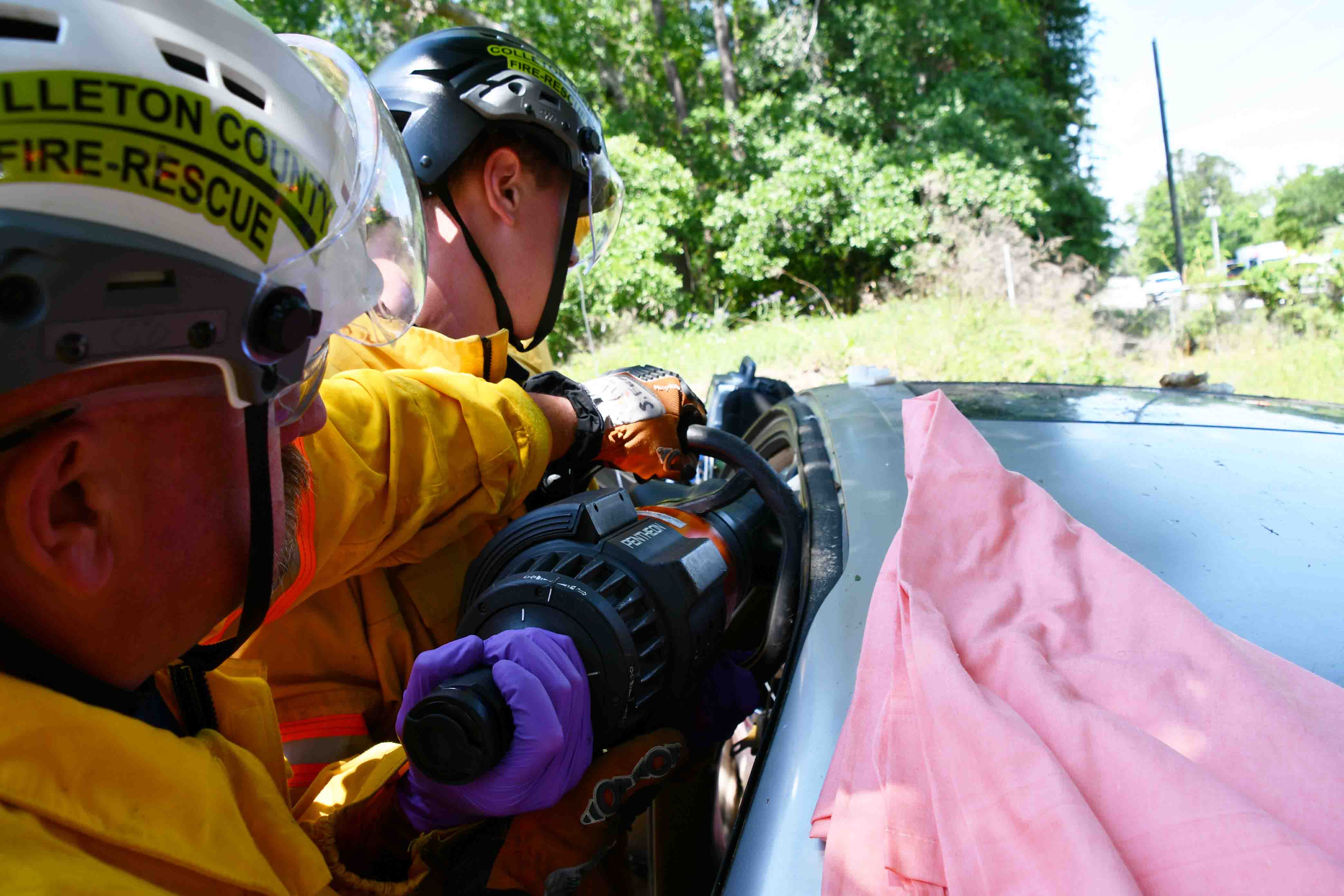 27/April/2025 - MVC with Entrapment - "B" Shift Incident # 25-03393 - An 18 yr old female was critically injured in a single vehicle MVC in the 500 block of Dorsey Street Sunday afternoon at 12:03. The west bound Infinity left the roadway, struck several fences and came to rest against a large pile of dirt. A portion of a fence pole went through the windshield and impaled the driver through the chest, exiting out of the rear of the seat. Firefighter-Paramedics stabilized the car and the fence pole. Crews used Holmatro Pentheon rescue tools to remove the rear door and "B" post on the driver's side. A band saw was used to cut the pole off so the patient could be extricated. She was removed onto a scoop stretcher which was padded in a raised position to allow the post to remain in place. The Meducare helicopter responded to the helipad at Colleton Medical Center and flew the patient to the Trauma Center at MUSC. The SC Highway Patrol is investigating the MVC. Engine 26, Rescue 1, Medic 13, Medic 26, Battalion 1m Car 104, Car 112 and Car 118 responded. Battalion Chief Brent Dalton served as Incident Commander. |