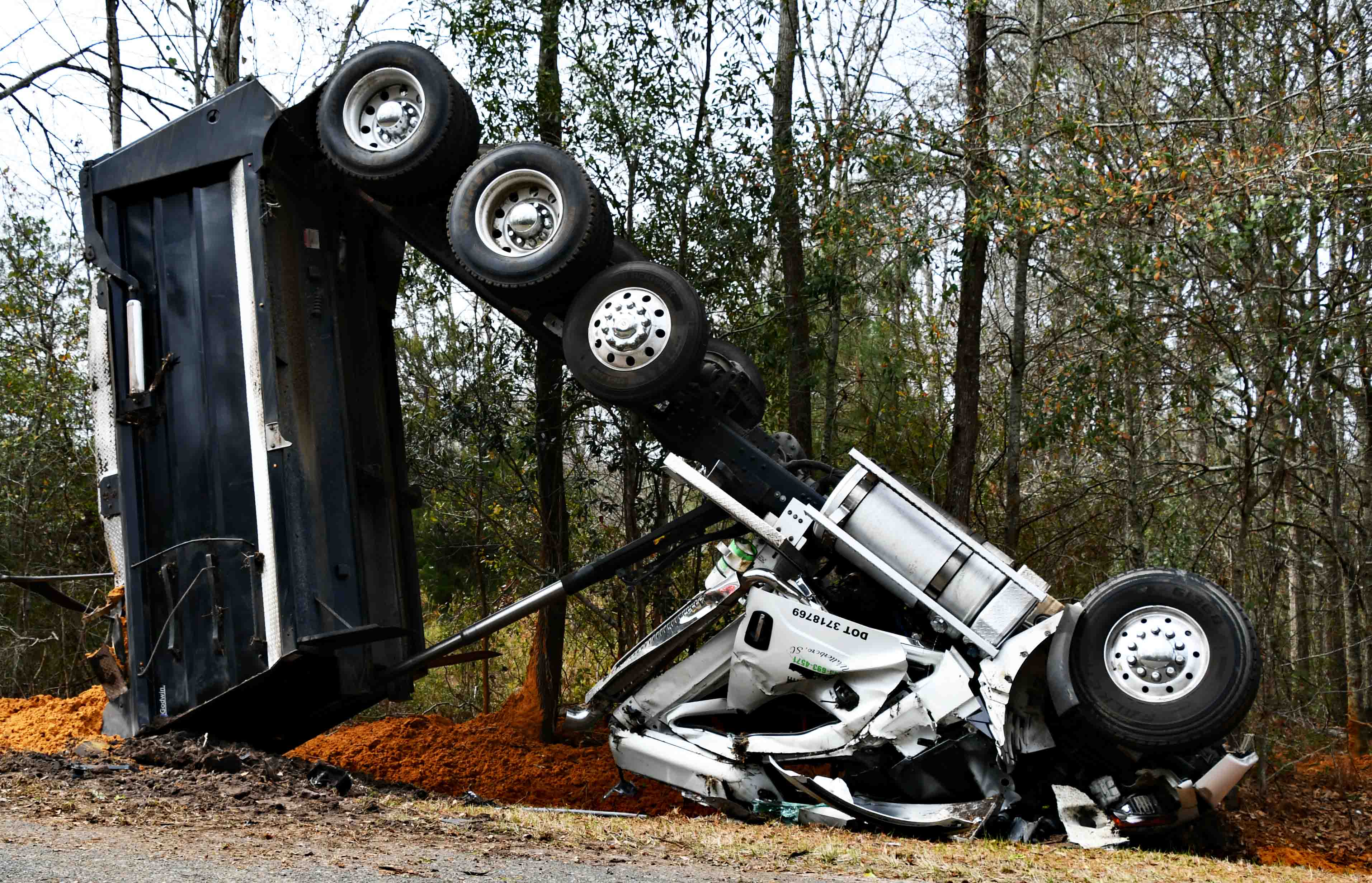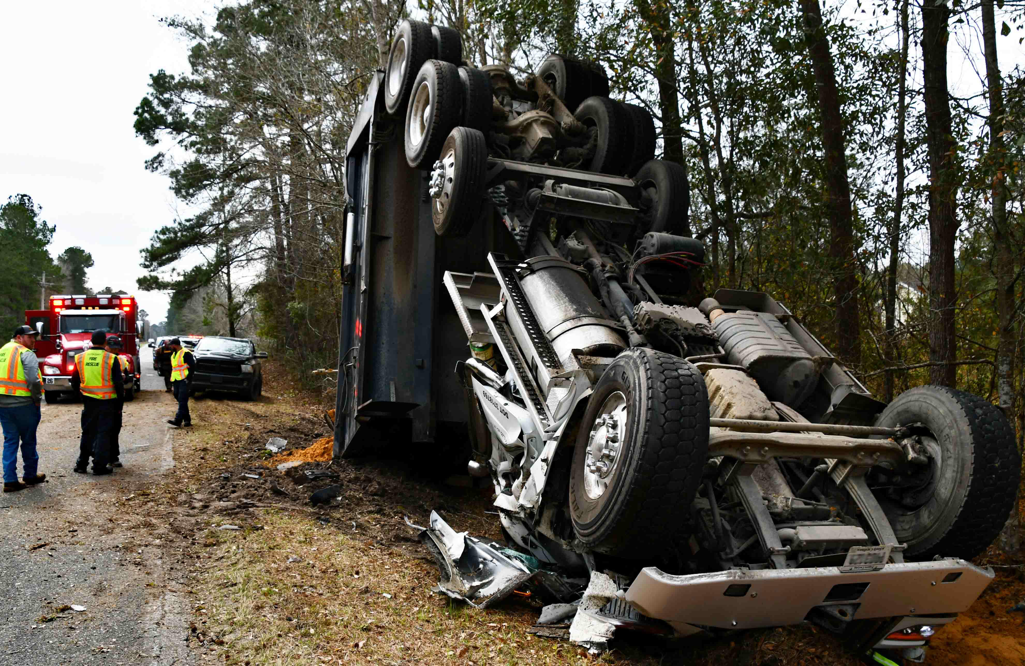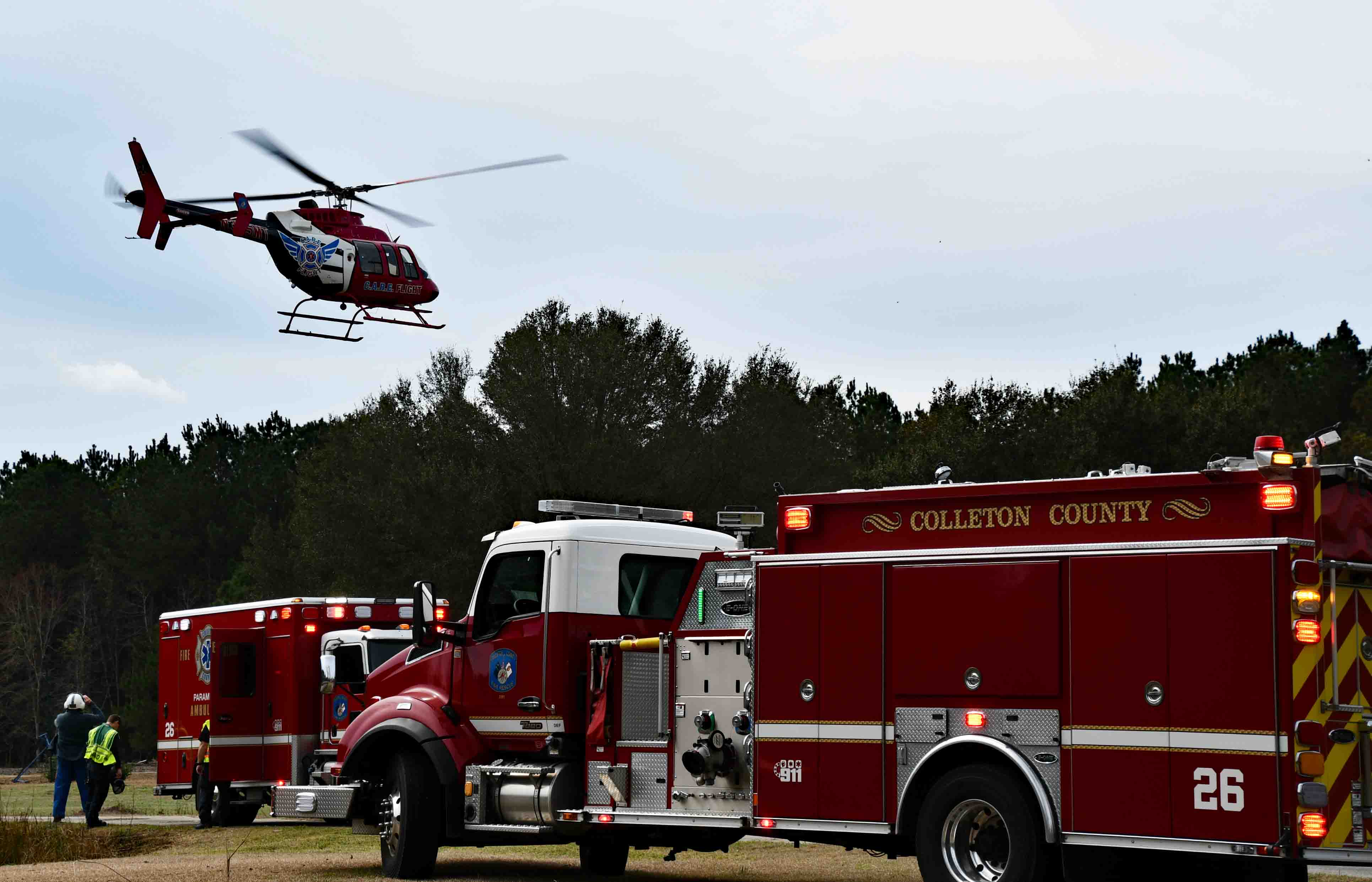 25/February/2026 - MVC with Air Evac - "C" Shift Incident # 26-01578 - A northbound dump truck lost control and overturned at the intersection of Mount Carmel Road and Wolf Creek Road Wednesday morning 25-Feb at 11:27. The truck received heavy damage in the accident. The adult driver was able to crawl out of the wreckage. The patient suffered multiple traumatic injuries, and was treated at the scene by Firefighter-Paramedics who requested a medical helicopter. CARE Flight responded and landed in the front yard of a residence near the accident site. The patient was transported the short distance to the helicopter, then transferred to the Flight crew. The patient was flown to the Trauma Center at HCA Trident Hospital in North Charleston. Mount Carmel Road was closed in the area of the accident for about 45 minutes, so recovery crews could clear the damaged truck from the scene. The accident is being investigated by the SC Hwy Patrol and State Transport Police. The Sheriff's Office assist with the traffic detour. Engine 26, Medic 26, Rescue 1, Battalion 1, Car 115 and CARE Flight responded. Captain Roger Johnston served as Incident Commander. |