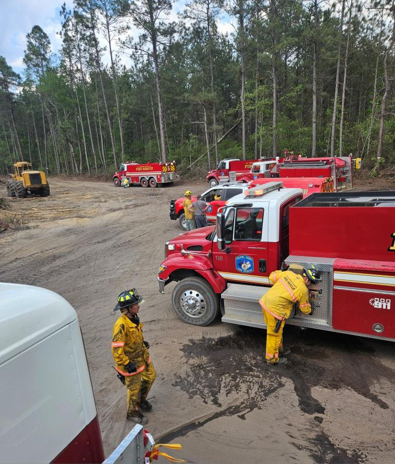 25/April/2026 - Woods Fire - “A” Shift Incident# - CCFR2603496 Drought conditions, low humidity, and gusty winds on Saturday, led to a previously contained fire to escape containment lines. The original fire occurred on Tuesday afternoon (Incident # CCFR2603373) and the South Carolina Forestry Commission (SCFC) spent three days after the initial fire reinforcing fire breaks. On Saturday, the SCFC Telecommunications Center received a report from concerned citizens that smoke in the area was heavier than previous days. SCFC requested Fire-Rescue to respond and check the area. First arriving units noted a large wall of fire rapidly moving through the dry vegetation. SCFC arrived on scene 20 minutes later with 3 fire plows, a Forestry Management Officer, and an aerial reconnaissance plane. Forestry Firefighters worked diligently to contain the fire, and protect logging equipment. Despite flowing 4000 gallons of water from two engines, SCFC ordered the evacuation of all suppression personnel. The fire was topping pine trees and was quickly approaching where firefighters were protecting the logging equipment. Prior to evacuating, crews were able to move two pieces of equipment to a safe location. Colleton Firefighters relocated to CCFR Station #7 to regroup. Crews and apparatus were prepped to deploy for structural protection. SCFC relocated to Bent Gate Lane and plowed several lines to protect the homes and residents on Bent Gate Lane. Thanks to a late afternoon shower and an increase in humidity, SCFC was able to contain the fire. Fire-Rescue was released and SCFC remained on scene. On Monday, 27-April, Fire-Rescue provided a Tender for SCFC’s Fire Cat (tracked firefighting machine). SCFC Firefighters will use the machine to check containment lines and suppress any active fire along the containment lines. Residents should expect a large number of SCFC Firefighters and equipment in the area of Sunrise Road and Bent Gate Lane. |
